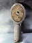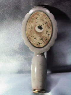 Item#ACC10: COTY HAND MIRROR VANITY CASE. Plastic Coty handmirror-shaped case. White confetti plastic with original puff (used), powder (Rachel), lipstick (Coty 24, used) and mirror (original, excellent). Gold and white decorative illustration depicts powder puff and florals. Overall condition, excellent. c. 1953. SOLD.