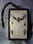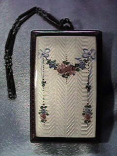Item ACC11: ENAMELLED PENDANT VANITY CASE. White champleve' enamel, herringbone pattern, with handpainted pink and blue flowers and ribbons. White metal, elaborately chased sides and wrist chain. Inside there are brackets for powder and rouge pots and a lipstick holder, ready to be filled. No puff, mirror is not original, scratches on back of case. 8 inches long with chain. SOLD