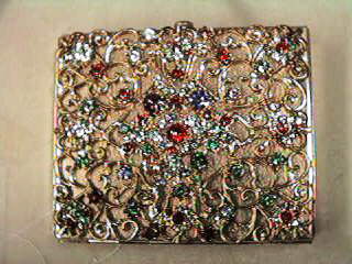 Item#COM10:JEWELLED DORSET COMPACT. Beautiful compact, covered with multicolored rhinestones and goldtone filigree. Mirror, puff and screen intact. Unused. Excellent. SOLD.