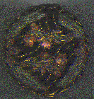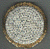 Item #ME001: FRENCH ENAMELLED AND BEADED COMPACT. The piece de resistance. Carry this in your evening bag and everyone will notice! Enamelling and hand beading, in shades of soft pink, green and purple on a black and gold striped background, form graceful florals and leaf sprays. Round compact has scalloped edges and design forms raised and textured top, with black and gold braid around the perimeter. Inside a bevelled mirror, powder screen an puff (puff not original). Signed "Made In France" on the mirror frame. 3 1/8 in. diameter. Two or three beads missing on back - we'll send them to you with the compact. Condition is beautiful. A real investment piece you won't see anywhere else. SOLD.