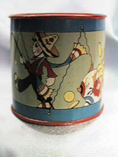Item#AT6: SIGNED AND NUMBERED LITHOGRAPHED TIN BANK. Little bank shaped like a drum, features marching children, piggy banks and coins. 3 inches high, signed Fern Bisel Peat, and numbered 16/101. One tiny paint chip on side, and small amount of rust on top rim. Key is included. SOLD