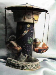 Item#AT7: LITHOGRAPHED TIN SPACE TOY. Tin litho amusement park ride-type toy has little rocket ships that revolve around the base, under a canopy. Lever action toy. Space ships are piloted by a spaceman, a robot, a dog and an alien. The base is meant to look like the surface of the moon. Column is decorated with comets, planets, stars, flying saucers, spacemen, space stations and rocket ships, as is the canopy. Under the canopy is an observation deck, and silhouettes of people are visible in the windows. Unsigned. Moderate amount of rust underneath the canopy. Neat toy! SOLD