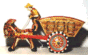Item # 5106: BALKY MULE Marx tin litho windup. Excellent condition. Farmer drives two wheel farm cart pulled by two mules. Brown mules and wagon, farmer dressed in brown overalls with yellow shirt and red neckerchief. Wagon has black and white striped tires on silver hubs with red and yellow decorations. 10 in. long. Signed "Marx, Made in The United States" on each mule. c. 1950s. $200.00