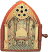 Item #7002: CHEIN MUSICAL TOY CHURCH. Very unusual toy by J. Chein and Co. Tin litho. Shaped like cathedral and ornately decorated to look like a church, with steeple, stained glass windows, tile floor and pipe organ. Turn crank on side and it plays organ music. Beautiful sound quality. 9 1/4 in. tall, with red wooden handle on crank. Signed "J. Chein & Co., made in USA" on bottom. Fine condition with very little paint missing. 1937. SOLD.