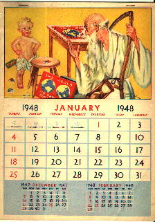 Item#CAL91: RUSSELL SAWBROOK CALENDAR 1948 Another calendar by the same artist as above, this one has different illustrations, and all are wonderful! 8.5 inches by 12.5 inches. Missing December page. HOLD.