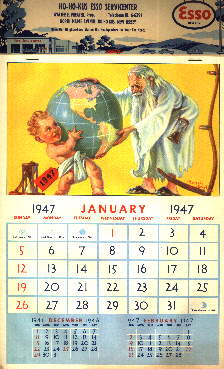 Collecting calendars is an inexpensive way to acquire and appreciate the art of prominent illustrators. They also make wonderful birthday gifts, as well as beautiful decorative elements in any room.Item#CAL92: ESSO CALENDAR 1947. Signed by the artist, Russell Sawbrook, each page of this calendar contains a beautiful and colorful illustration, suitable for framing. One is more wonderful than the next! Advertising for New Jersey Esso station. Slight foxing around border. Measures 8.5 inches by 14.5 inches (top margin doesn't show in picture - it wouldn't fit in the scanner). A fabulous calendar! SOLD.