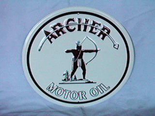 Item #R115: Archer Motor Oil. Tin sign features a picture of an Indian with bow and