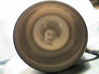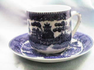 Item #OGF1: LITHOPHANE CUP AND SAUCER. Lovely little Japanese cup and saucer, blue on white. Drink the tea, and a Geisha appears in the bottom of the cup! CLICK HERE TO SEE THE GEISHA. Perfect condition. $55.00.