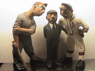 Item #UMP: BASEBALL PLAYERS. Two baseball players, pitcher and batter, square off for the battle royale. Standing between them, and seemingly unperturbed, is the umpire. you can pose these any way you want - make the players glower at each other, or sic them on the ump! The players measure almost 8 inches tall, and the ump is almost 7 inches. All three figures carry the signature "LL Rittgers, 1941. Condition of all three figures is very good, with just a few small chips in the paint, mostly on their shoes. It's unusual to find these in such wonderful condition. SOLD.
