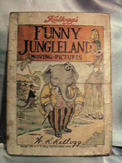 Item #ADV16:KELLOGG'S FUNNY JUNGLELAND. Patented in 1907 and published in 1909. Inside are drawings of dressed animals. The book is divided into horizontal strips, so that you may arrange an elephant's head on a horse's body with a giraffe's legs, etc. There is a horizontal fold across the book and many minor small tears around the edge. In addtion, there are faint pencil scribblings on one edge of the cover. Inside images are all intact, and accompanied by funny poems. Kellogg's cereal is subtly plugged wherever possible, and the back cover has a sweet ad for Kellogg's Toasted Corn Flakes. Neat old advertising piece! $35.00