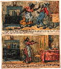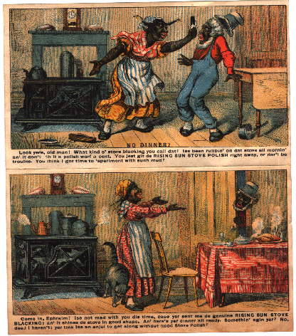 Item #TB9: DOUBLE- SIDED TRADE CARD, BLACK SUBJECT. Card advertises Rising Sun Stove Polish. On one side wife is brandishing a hunk of stove blacking. The caption reads, "No Dinner!". On the other side, she is saying "Come in Ephraim!", as he cautiously pokes his head in the door. Card measures 3.25 inches high by 5.75 inches wide. Condition is excellent. SOLD