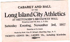 Item #TBBB01: 1917 TICKET TO CABARET AND BALL FOR BASEBALL TEAM. Admission ticket to cabaret and ball for the Long Island City Athletics, a baseball team. Dance was held on November 3, 1917 in New York. Back of the ticket has lyrics to song, "Where Do We Go From Here, Boys?". Mint condition. $25.00
