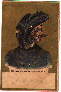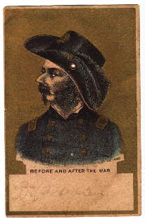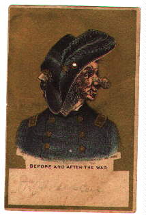 Item#SW161: "AGING" MECHANICAL TRADE CARD. This trade card depicts a soldier in Civil War uniform, with officer's braid on his shoulders. The caption says, "Before The War and After". Swing his hat around and it reveals an old and decrepit toothless man with bulbous nose. Card measures 2.25 inches by 4.75 inches. Condition is very good. SOLD