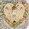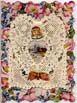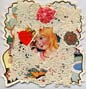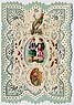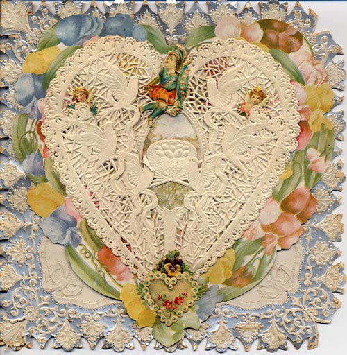 Item# VAL223: EXTRA LARGE EMBOSSED LAYERS AND LACE VALENTINE. This one is very old and very big. Embossed layers of silver, pastel flowers, a lacy layer that includes doves and eggs in a nest, with embossed hearts, children, and even a little warrior. Inside, the message says, "I wish thee comfort, Joy and Peace, and Love In endless measure." along with a black-and-white stylized illustration. Pencil signed in back. 7 3/4 inches square. This one is for the serious collector. It's priced very low for what it is, because it has wear, and the back is stained, but you won't see many others like it. Probably made in Germany, circa 1880. SOLD.