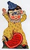 Item# VAL226: MECHANICAL LITTLE CLOWN VALENTINE. How adorable! A little clown in blue hat and yellow costume, straddles a heart that says, "Take a chance and be my valentine." He's holding a mask in front of his face and, when his arm is moved, he plays "peek-a-boo" and reveals his face. 5 inches high, with fold-back easel. Inscribed on back. In excellent condition. Made in USA 1929. SOLD.