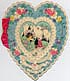 Item# VAL227: EMBOSSED BE-RIBBONED VALENTINE. This is one of those great "window" valentines. Tied with a pink ribbon, it's an ornate blue, silver and flower-embossed heart-shaped frame that displays two people walking near a country cottage. The front reads, "Valentine Greetings To The One I Love Best". Inside, the poem reads, "Some folks will send greetings to Sweethearts today, And some to their Pals, tried and true, But this valentine missive goes on its way to a Pal and a Sweetheart too." And that's the way it should be, don't you think? 8 inches high, in excellent condition. Unused. Made in USA circa 1910. SOLD .