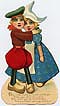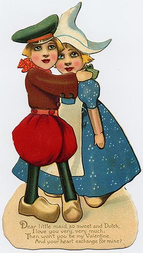 Item# VAL288: RAPHAEL TUCK DUTCH CHILDREN VALENTINE. These two embracing Dutch kids look positively dreamy-eyed. They're a pair of blue-eyed blonde kids in brilliantly colored traditional Dutch costume. The card reads, "Dear little maid, so sweet and Dutch, I love you very, very much; Then won't you be my Valentine, and your heart exchange for mine?" Card has an easel on the back for standing up. 7 inches high. In excellent condition.By Rapahel Tuck & Sons. Printed in Germany circa 1890. $15.00.