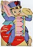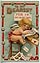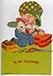 Item# VAL232: GERMAN MECHANICAL LITTLE HANDYMAN VALENTINE . What a cutie! Little boy in checkered cap uses the tools from his cigar box to construct a valentine. When his arm is lifted to hit the nail, his eyes move too. You can see all the bent nails he discarded, lying on the floor. And we guess he missed a couple of times, because there's bandage on his finger. The two hearts he is trying to nail together are labeled "Yours" and "Mine". 5 3/4 inches high. In very good condition, with two tiny spots on the front. Printed in Germany circa 1924. Pencil signed and dated 1924 in back. SOLD .