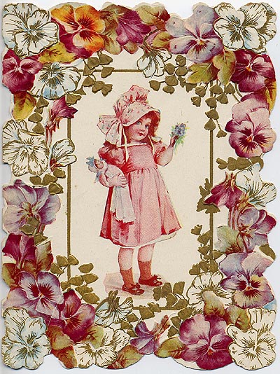 Item# VAL231: EMBOSSED GIRL WITH DOLL AND PANSIES VALENTINE. A darling girl in a pink bonnet holds her dolly in one arm and a bunch of flowers in her other hand. She is standing in a frame of multicolored pansies, embossed and highlighted in gold. Inside, a poem entitled Think Of Me. "In after years, when you recall The days of pleasure past, And think of joyous hours, and all have flown away so fast; When some forgotten air you hear Brings back past scenes to thee, And gently claims your listening ear, -- Keep one kind thought for me." 4 3/4 inches by 6 1/4 inches. Small tear hidden in the decoration; overall very good condition. Signed in back. Printed in Germany circa 1910. SOLD.