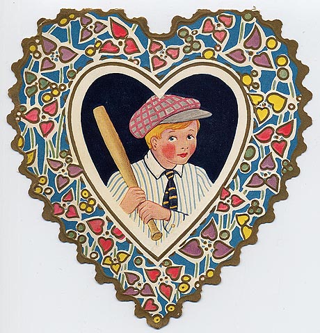 Item# VAL233: WHITNEY EMBOSSED BASEBALL PLAYER VALENTINE. Embossed stained glass-type floral border with a boy in cap, striped shirt and tie, weilding a baseball bat, in center. He's wearing cufflinks! Indie, the poem reads, "To My Valentine, If all the trees were made into pens, And all the seas were ink, I could not write the words to tell, One half the love I think." They just don't write them like that anymore. A great valentine for the athlete in your life. 5 inches high. Signed on back. Whitney, made in USA, circa 1920. Excellent condition. SOLD.