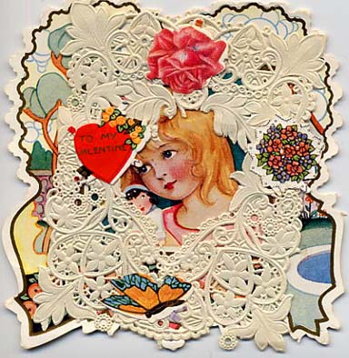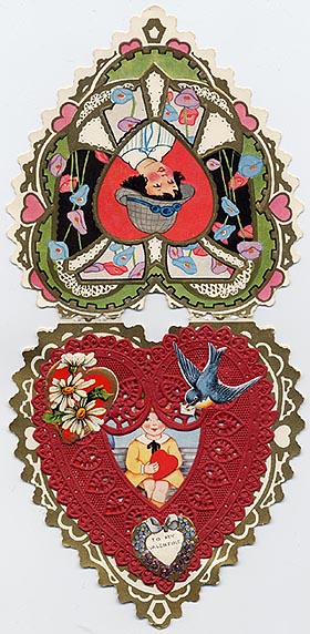 Item# VAL701: EXCEPTIONAL VERTICAL-OPENING WHITNEY VALENTINE. This lovely Whitney valentine is large (6 1/2 inches, top to bottom), is quite layered and lacy, and opens at the bottom. There's a boy, a girl, and a dog under the lace. The front is adorned with a cupid and a bunch of flowers. Inside, a little girl with her doll sits on a bench and feeds a goose. The poem inside says, "To My Valentine: There's plenty of room on this bench for you, There's room in my heart as well, How I want you for my Valentine, I hardly dare to tell."Pencil inscription on inside and back. In pristine condition. Circa 1920s, USA. SOLD.