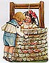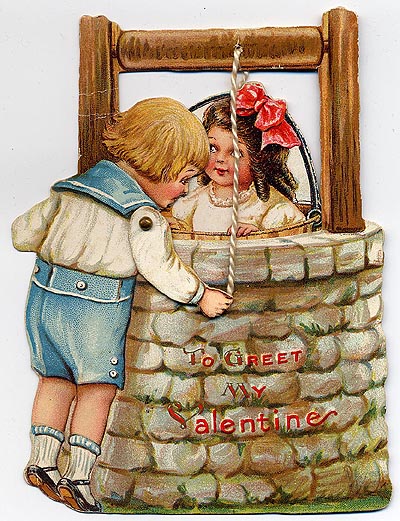 Item# VAL235: MECHANICAL BOY WITH GIRL IN WELL VALENTINE. Young boy in sailor suit pulls a string and brings up a red-ribboned girl in a bucket from the well. Of course, you can raise his arm and lower her back into the well. Perhaps this is the valentine to send to the person with whom you have a love-hate relationship. Or maybe it should go to the person to whom you are unable to commit. It says, "To Greet My Valentine." Go figure. 5 1/4 inches high. Pencil-signed on back. In very good condition, with a couple of creases to one of the well posts. Printed in USA circa 1900. $25.00.
