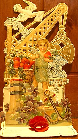 Item# VAL237: EMBOSSED GERMAN NAUTICAL CONSTRUCTION PULL-DOWN VALENTINE. This one is either the most specific occupational valentine ever created, or it's the most interesting mix of metaphors ever. There's a dove with a letter in its mouth, a winged cherub with a basket of hearts that say "To my valentine", a golden construction crane full of forget-me-nots, an anchor, a hitching post and a red honeycomb. Three layers. The poem inside reads, "Just these few words from me, Wherever thou may be, Forget me not." Here's a picture of it CLOSED.7 1/2 inches high. Made in Germany c. 1890. In very good condition, with some wear to the fold. Know a construction worker? A sailor? A florist? This is the card! $58.00.