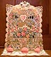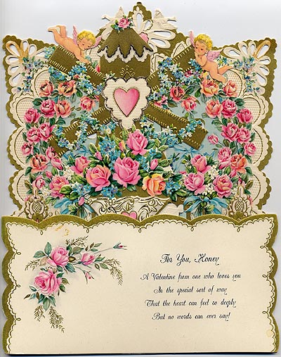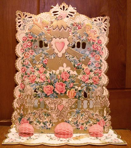 Item# VAL238: VERY LARGE EMBOSSED PULLDOWN VALENTINE. . This is the "youngest" valentine on the site, but we included it because it is so lovely. Winged cupids hover at a golden windmill on this three-layer flower-bedecked card, with not one, but THREE pink honeycombs at the bottom. Here's a picture of it CLOSED. It's 9 1/2 inches high and 7 1/2 inches wide. Small amount of foxing here and there. Otherwise, excelllent condition. Signed "Charles 1968" on the back. A Hallmark card, made in USA . $10.00.