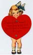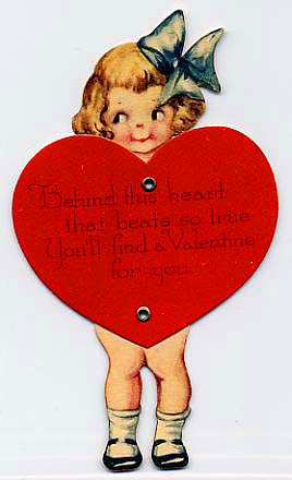 Item# VAL311: GIRL WITH BIG HEART MECHANICAL VALENTINE. This little girl with a bow in her hair and Mary Janes on her feet can be hidden completely behind the heart. The heart says, "Behind this heart that beats so true, You find a Valentine for you." 4 1/2 inches high, fully extended. Slight foxing on the back. Overall very good condition. Unused. Circa 1920. SOLD.