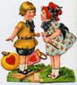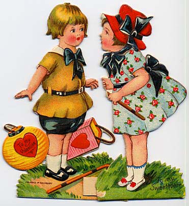 Item# VAL316: TWO VERY ADORABLE CHILDREN EMBOSSED STAND-UP VALENTINE. This is one of those valentines that stands up by means of the front layer being pulled forward, to form a rectangle at the base.. The sweetest little girl in flowered dress, bonnet red hat, and shoes adorned with hearts, faces a little boy with a bow tie. On the floor are a pair of heart-adorned Chinese lanterns. One of them reads, "To My Valentine". At the girl's feet it says, "To My Sweetheart." 4 1/4 inches high. It appears that the girl may have been holding long pole at one time; it is no longer there. Condition otherwise is pristine. Pencil signature on back. Printed in Germany circa 1900. $23.00.