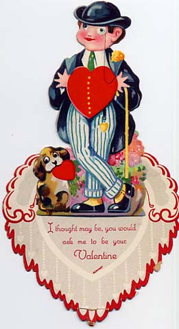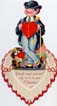 Item# VAL318: GENT WITH BOWLER AND MONOCLE STAND-UP VALENTINE. A monocled gentleman with striped pants, tail coat, bowler, walking stick, and watch fob, shows his heart-shaped vest. At his feet, a puppy with a heart in his mouth. The poem says, "I thought may be you would ask me to be your Valentine." The valentine stands up by means of a sliding easel in the back. The man winds up on the heart-shaped base.Unused. 4 inches high when standing up; 6 inches long when folded flat. One crease at thepoint of the base, otherwise in excellent condition. German. Circa 1900. SOLD.