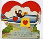 Item# VAL702: LITTLE PILOT VALENTINE. Young pilot in brown flight suit, waves from his valentine-adorned plane. It says, "In plane words, I'm up in the air my Valentine." Great choice for the airplane enthusiast in your life. 4 3/4 inches high, very colorful, with gold accents, with three dimensionsal wing. Easel on the back.Slight foxing on the back. Slight crease on the front - much less visible in person than in the magnified photo. Inscription on back. Made by the Carrington Co., Chicago, IL. Circa 1930s, made in USA. SOLD.