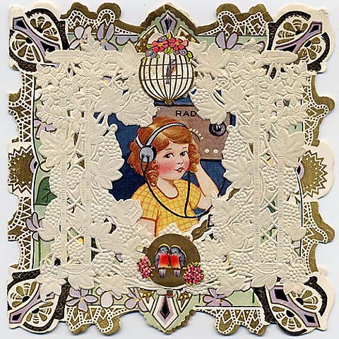 Item# VAL705: WHITNEY LITTLE RADIO OPERATOR VALENTINE. This World War II-era valentine features a little girl at her post as a radio operator, framed in fancy grape and grapevine lace, with medallions containing lovebirds.The embossed backfround contains multi-colored flowers with gold accents as only Whitney could do them.Inside, a boy and girl sit on a crexcent moon and listen in on the radio line. The poem reads, "I breathed a message into the air. It fell to earth, I know not where. If you "listened in" then you'd know That you are my valentine, I love you so!" 5 1/2 inches square, tear at top (hidden in he busy pattern of the front, goes through to the back. Maade in USA, circa 1920s. $8.00.