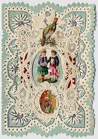 Item# VAL706: LACY TWO-LAYER VALENTINE. A young boy in knee britches presents a valentine to a girl in an oval lace dimensional frame, adorned with a bird and an artist's palette. All this is mounted on an embossed blue and silver background. Inside, a drawing of water lilies and a poem: "When first I saw thee, dearest one, Chief among the young and fair, Little did I think that then, Cupid's self was lurking there, Knew not till I felt the dart, Thou hads't borne away my heart!" Sigh. Send her this one and she's yours! 5 1/2 inches high, in excellent condition, unused. Americn, circa 1900. SOLD