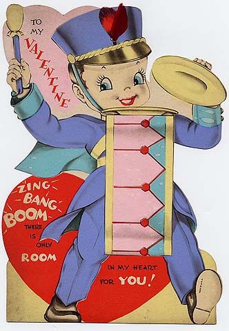 Item# VAL707: ONE BOY MARCHING BAND VALENTINE. This cute blue-eyed boy with a real feather in his hat plays the cymbals and beats the drum. Card says, "To My Valentine: Zing Bang Boom - There is only room in my hearts for you!". This is a large valentine - 8 1/2 inches high. A little dirt at the top and bottom edge, otherwise in excellent condition. Made in USA, circa 1940s. $7.00.