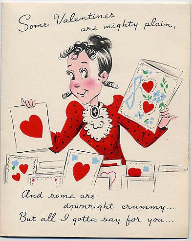 Item# VAL709: MODEST WOMAN VALENTINE.She's very prim and proper on the outside, but the inside of the card depicts a heartthrob! Front says, "Some Valentines are mighty plain, And some are downright crummy...But all I gotta say for you...(inside) Yummy! Yummy! Yummy! The hot number inside is clutching a valentine. 5 inches high, in pristine condition, unused, made by Norcross, a company that's been out of business since the early 80s. Comes complete with the original envelope. Made in USA, circa 1940s.