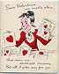 Item# VAL230: EMBOSSED GERMAN SCRIBE VALENTINE. Here's one to send to your favorite office worker. A winged cupid turns away from his busy writing task to face the viewer. A sign on the wall says, "Feb 14 My Busy Day." Gold embossed hearts and red ribbons form the frame to the card, entitled, "To My Dearest." Cupid has been busy writing sentiments like, "My dear Valentine will you be mine?", and his work litters the floor. 3 1/2 inches by 5 1/2 inches. Postcard back. Printed in Germany 1910, inscribed 1912 on back. Excellent condition. SOLD .