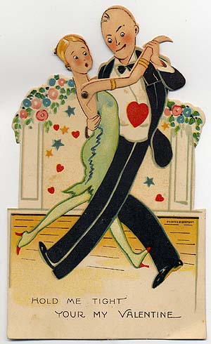 Item# VAL445: SLEEK MECHANICAL VALENTINE FOR THE GRAMMATICALLY CHALLENGED. A pair of elegant dancers in formal attire trip the light fantastic. He seems to be working very hard, and she seems to want to be somewhere else. A tab on the back raises and lowers their arms. Valentine reads "Hold MeTight, Your My Valentine ." We are not responsible for copy writers who don't know the difference between "your" and "you're"! It's a big one: about 7 1/2 inches high. in wonderful condition. American, C. 1920.SOLD.