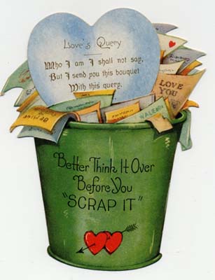 Item# VAL888: WASTEBASKET OF LOVE VALENTINE.In their quest for originality, valentine copywriters sometimes crossed over into the absurd. Here's a wastepaper basket valentine with a removable heart. It says, "Love's Query: Who I am I shall not say, But I send you this bouquet, With this query Lady Mine, Will you be my valentine?" The pail, which is full of love notes, says, "Better Think It Over before you 'Scrap' It'". Approxiimately 5 inches tall with the heart in place. Unused. Small amount of foxing on the back of the heart. Everything else is perfect. American C. 1920. SOLD.