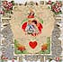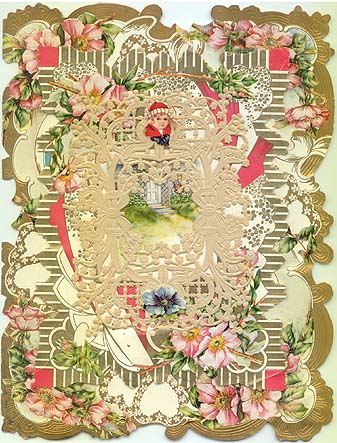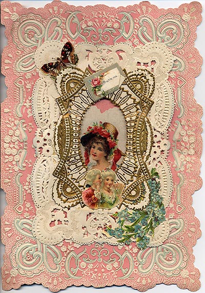 Item# VAL221: VERY OLD, VERY LARGE EMBOSSED LACY LAYERED VALENTINE. This one has everything: It's very large, has a pink and blue frame, paper lace, blue flowers, a man and a woman with a fan, a tiny card that says, "Trust to me", and a lady in a bonnet. INside, the poem reads, "Fondly I'm dreaming, Thou thinkest of me, Truth, and not seeming My motto shall be, Love ever beaming From myheart to thee." 6 1/2 inches by 10 inches. In very good condition. Unused. Printed in Germany circa 1880. SOLD.