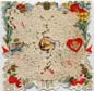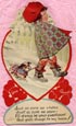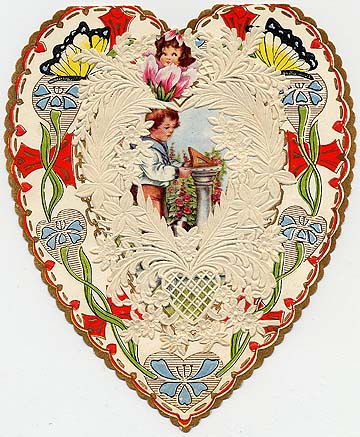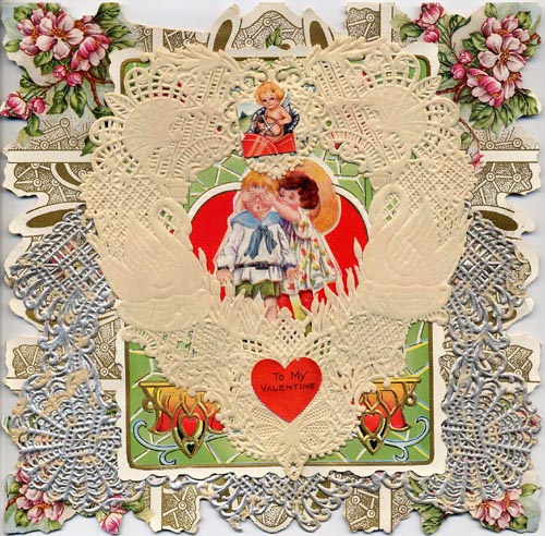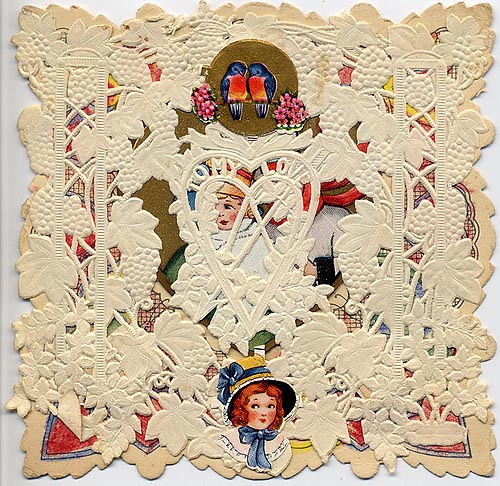 Item# VAL224: LACY HAND-COLORED VALENTINE. The paper lace overlay on this one has hearts and flowers, and says, "To My Love". Underneath that there's a boy and girl in winter attire and a border that has been lovingly hand-colored in crayon by a child. It's colored in red, yellow, and blue, and is quite lovely. 4 1/2 inches square. In very good condition. Faint pencil inscription on back. Made in USA circa 1900. $8.00.