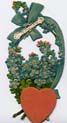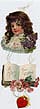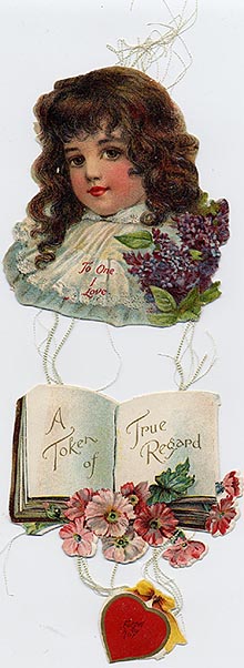 Item# VAL225: EMBOSSED THREE-PART RIBBON VALENTINE. This is a sweet three-parter, all embossed, all suspended from a thin, pale green ribbon. The top is a child with purple flowers, and is inscribed, "To One I Love". The second part is an open book with more flowers, inscribed, "A Token of True Regard". The bottom is a tiny heart with a golden bow. It says, "Forget Me Not." The whole thing is 9 inches long when hung. The ribbon is frayed, but still hanging in there. Overall in excellent condition. Printed in Germany, circa 1890. $28.00.