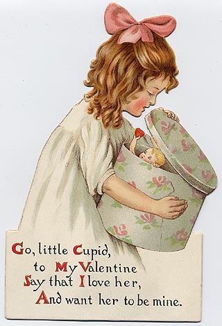 Item# VAL236: RAPHAEL TUCK BEAUTIFULLY LITHOGRAPHED VALENTINE. Girl with a pink ribbon in her hair holds a floral-printed hatbox containing a little cupid holding a heart. The poem says, "Go, little Cupid, to My Valentine, Say that I love her, And want her to be mine." So this little girl has received quite a Valentine's Day gift! If you consider a small live creature in a hatbox to be a great gift. This is a fine example of the quality of cards by Raphael Tuck & Sons, the premier manufacturer of cards in the late-19th and early-20th century. Self easel, which came off and has been professionally re-attached with archival materials. Otherwise excellent condition. Printed in Germany circa 1890. $45.00.