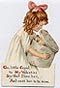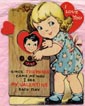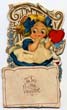 Item# VAL308: DARLING LITTLE GIRL PULL DOWN VALENTINE. This valentine scores a "10" on the cute scale. A wide-eyed blonde girl in blue dress and pinafore holds a heart in her hand.In the background are a heart-adorned harp, sheet music, and a dove carrying a heart-adorned envelope. The base says, "To My Valentine". When pulled down, the poem on the inside of the base reads, "To My Valentine. My heart is red, your eyes are blue. My love for you is sweet and true." 4 1/2 inches high. Some foxing and wear at the fold. Inscribed on back. German, circa 1890. $15.00.