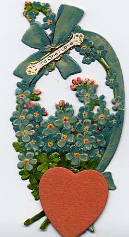 Item# VAL315: SENTIMENTAL EMBOSSED VALENTINE. A sweet and simple basket of flowers, tied with a blue ribbon and the message, "To One I Love". At the bottom, a heart that folds forward. 5 1/4 inches high. One crease on right side; otherwise in excellent condition. Inscription on back. Printed in Germany circa 1890. $8.00.