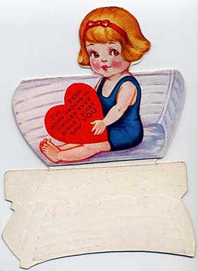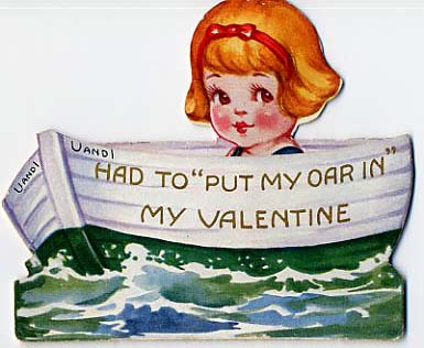 Item# VAL319: GIRL IN A ROWBOAT EMBOSSED STAND-UP VALENTINE. This cute reheaded girl ina rowboat named Uandi says, "had to 'put my oar in' my valentine". Fold down the front and INTERIOR VIEW there she is in a blue bathing suit, holding a heart that says, "I've been going around in circles ever since I first saw you." Pull the girl slightly forward to form the stand-up. 3 3/4 inches across. In excellent condition. Pencil inscribed on back. Made in Germany circa 1920. SOLD.