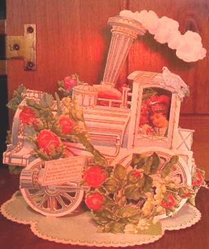 Item# VAL321: FABULOUS DOUBLE PULLDOWN LAYERED VALENTINE. A locomotive layered with roses and lilies of the valley, with a smokestack and pink honeycomb. A beautiful boy in a sailor suit and a girl clutching a bunch of violets peek through the window of the locomotive, while a dove perches on the roof. A poem in the front says, "To my Valentine, In these blue forget-me-nots, In these fragrant roses too, Read the message fond and true, From my faithful heart to you." This valentine folds down in two directions - front and back to make a very stable standing display. 6 1/2 inches high. Very good condition. Professionally restored. Inscribed on back and dated 1909. Made in Germany. $150.00.