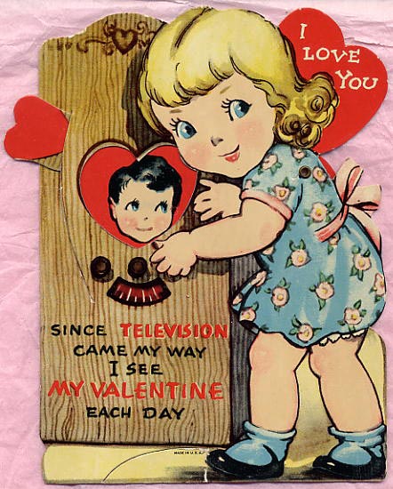 Item# VAL57: MECHANICAL TELEVISION AS IT WAS IN THE 1940S VALENTINE. A young girl fiddles with the knobs on a very early television set. Caption reads, "Since television came my way I see my Valentine each day". Her love is pictured on the heart-shaped screen. Move the heart-shaped lever and he's replaced with the words, "My Valentine". 5 3/4 inches high, Made in USA, in excellent condition, self easel. Signed in pencil on the back, and dated 1944. SOLD .