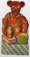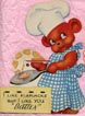 Item# VAL58: GREAT MECHANICAL BEAR WITH FLAPJACKS VALENTINE. This bear in blue checkered apron is making heart-shaped flapjacks. The caption reads, "I like flapjacks but I like you batter". Groan. Spin the wheel and the flapjacks jump out of the pan and into the plate. Of course, you can always spin the wheel the other way and make the flapjacks go back onto the griddle, if you like. 5 3/4 inches high. Made in USA. Signed in ink on the back and dated 1942.. In excellent condition. $8.00.