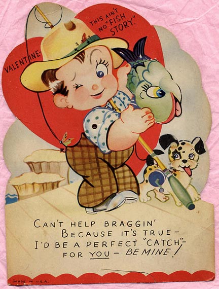 Item# VAL59: MECHANICAL FISHERMAN VALENTINE. This great little fisherman, says, "This aint no fish story", and "Can't help braggin', Because it's true, I'd be a perfect catch for you - be mine!" This one's great if you know someone who fishes. Move the lever and you can make his little fish grow bigger and bigger! 8 1/4 inches high, self easel, Made in USA, Signed on back and dated 1945. One faint crease near the top; otherwise in overall excellent condition. SOLD.